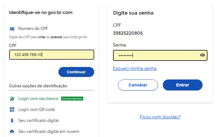 Faça o Login na sua conta Gov.br com seu CPF e senha OU via Certificado Digital;