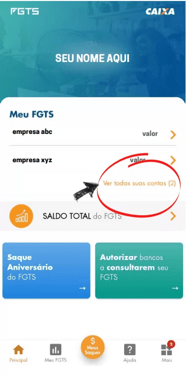 Na tela inicial, clique em “Ver todas suas contas” , conforme indicado na imagem ao lado.