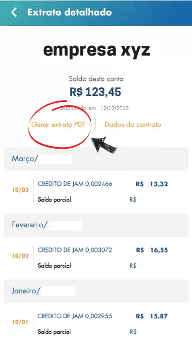 Em seguida, clique em “Gerar extrato PDF” , conforme indicado na imagem ao lado e será feito o download no seu celular.