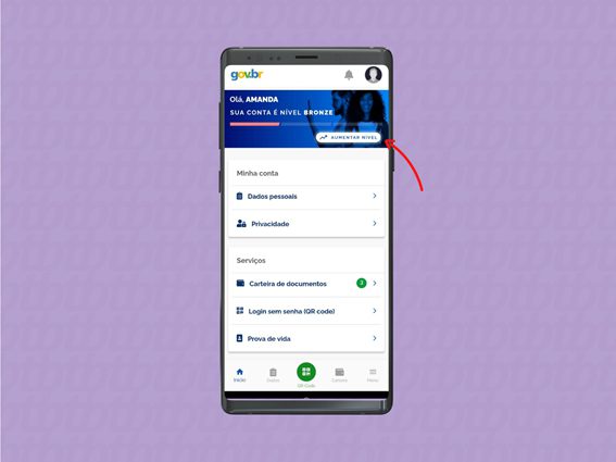 Na página inicial do aplicativo, no topo, já é possível ver o seu nível e, logo abaixo, o botão “Aumentar nível”. Na sequência, o app te encaminha para as formas de validação disponíveis para o seu perfil.