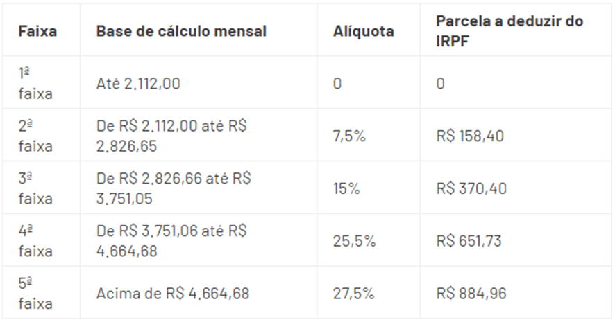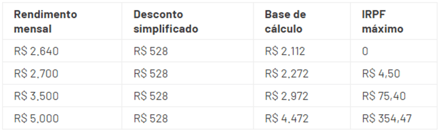 Vale lembrar que, devido o desconto simplificado, quem ganha até R$ 2.640 estará isento do imposto.
